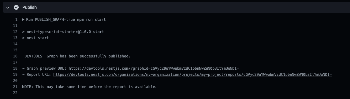 As we can see, we're using the GraphPublisher here to publish our serialized graph to the centralized registry. The PUBLISH_GRAPH is a custom environment variable that will let us control whether the graph should be published (CI/CD workflow), or not (regular application bootstrap). Also, we set the preview attribute here to true. With this flag enabled, our application will bootstrap in the preview mode - which basically means that constructors (and lifecycle hooks) of all controllers, enhancers, and providers in our application will not be executed. Note - this isn't required, but makes things simpler for us since in this case we won't really have to connect to the database etc. when running our application in the CI/CD pipeline.