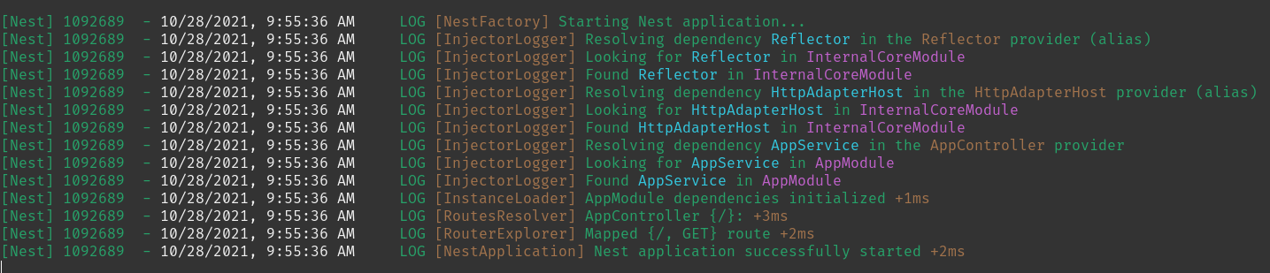 In the above image, the string in yellow is the host class of the dependency being injected, the string in blue is the name of the injected dependency, or its injection token, and the string in purple is the module in which the dependency is being searched for. Using this, you can usually trace back the dependency resolution for what's happening and why you're getting dependency injection problems.