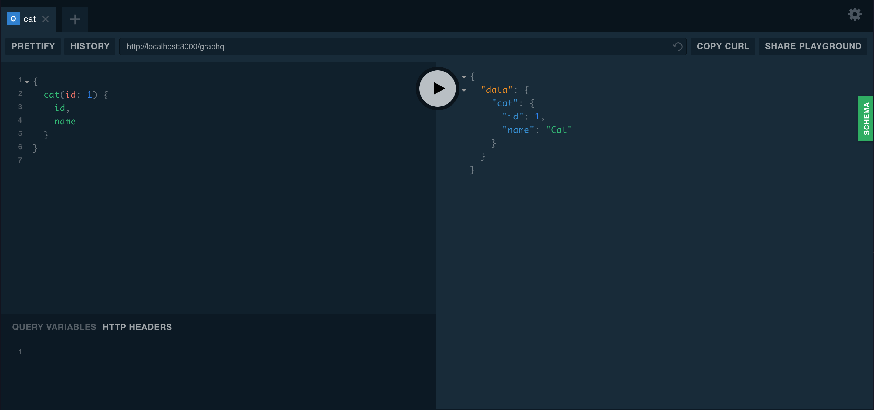 The playground is a graphical, interactive, in-browser GraphQL IDE, available by default on the same URL as the GraphQL server itself. To access the playground, you need a basic GraphQL server configured and running. To see it now, you can install and build the working example here. Alternatively, if you're following along with these code samples, once you've completed the steps in the Resolvers chapter, you can access the playground.