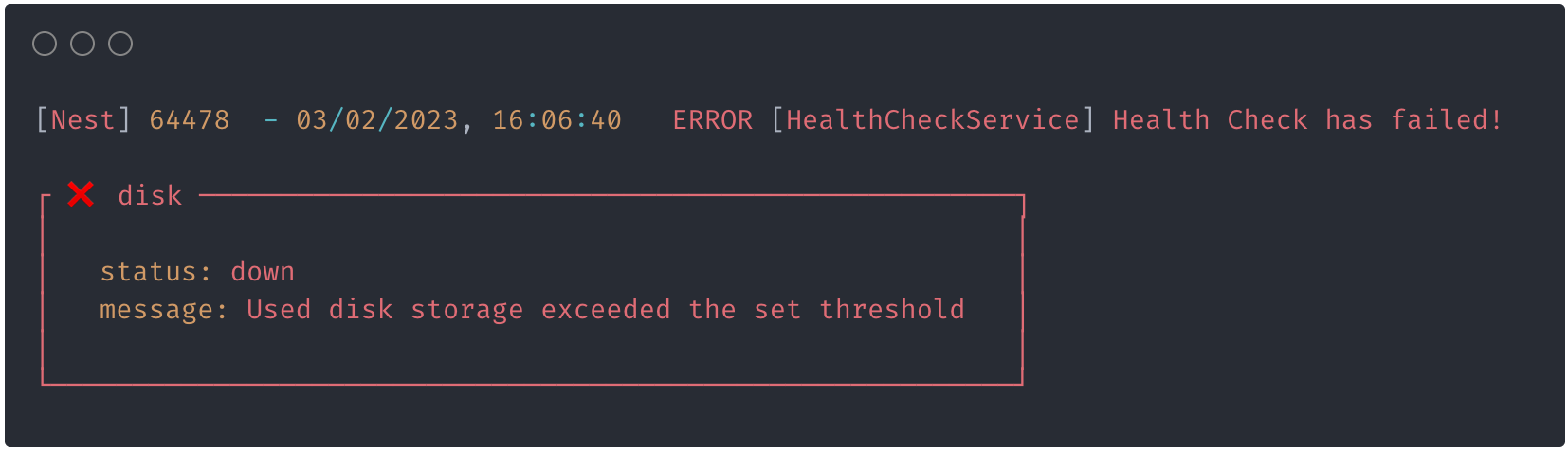 In some cases, the predefined health indicators provided by @nestjs/terminus do not cover all of your health check requirements. In that case, you can set up a custom health indicator according to your needs.